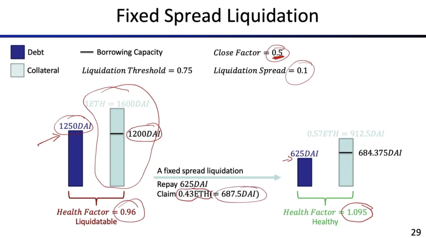 而在 DeFi 中,清算机制大大简化。例如 固定折价清算(fixed-spread liquidation):