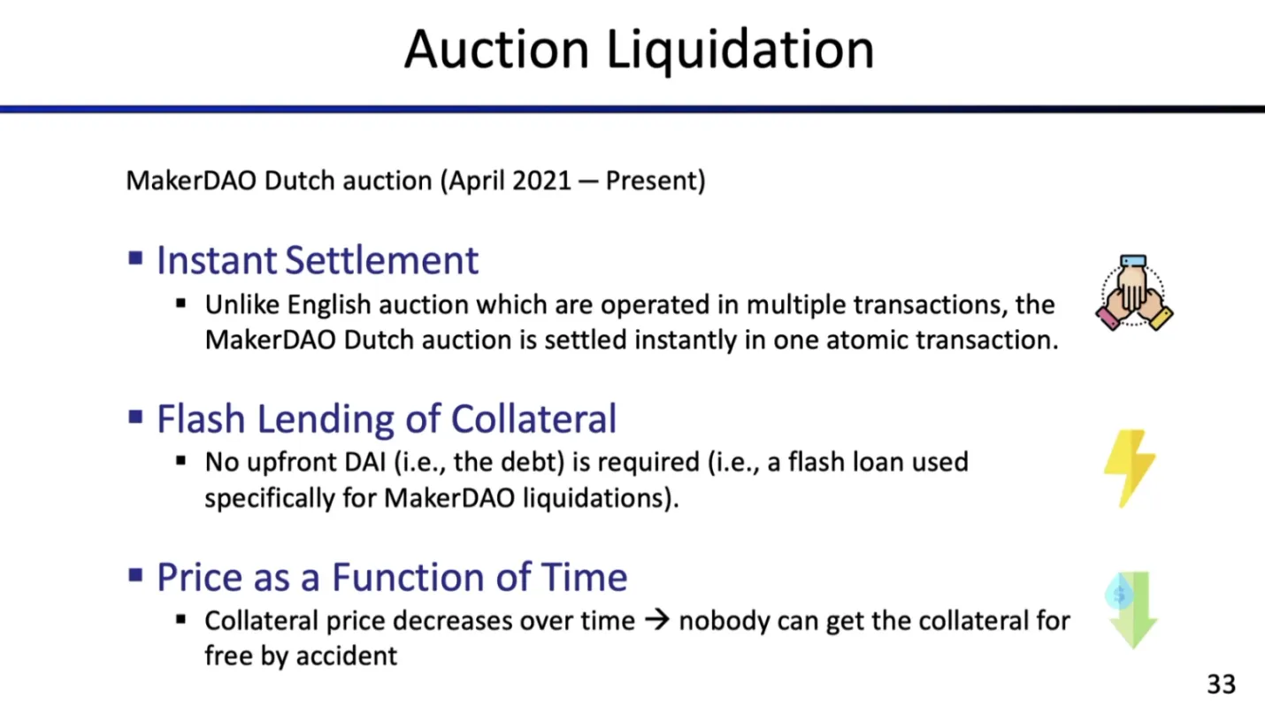优势:无需提前准备 DAI、大幅简化清算机制、避免竞标者意外免费获得抵押物(MakerDAO 2020 年黑色星期四事件的教训)