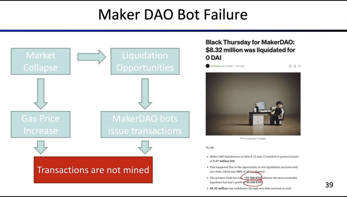 - 清算利润:在同一时间范围和平台中,仅清算就产生了 6,360 万美元利润。出现过极端值,例如 2020 年 3 月,一次 MakerDAO 清算机器人失效,导致以太价格暴跌时,清算者竞标极低或几乎未出价,当天清算者利润达到约 1,300 万美元。