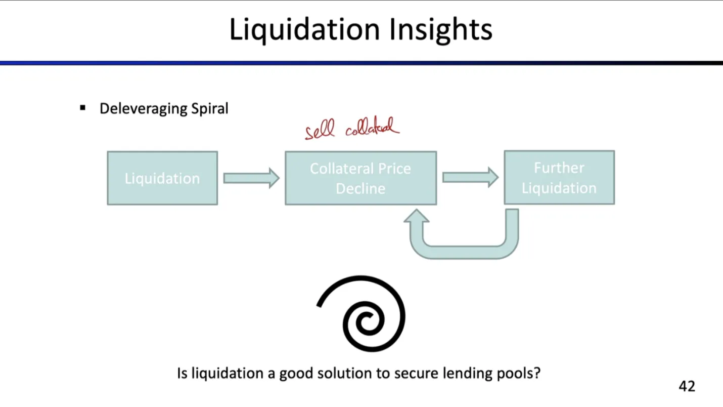 如果发生清算事件,清算者有时会立即进行原子清算,当抵押物价格下降时,他们可能出售刚购买的抵押物,这将触发额外清算;这可能形成持续循环,被称为去杠杆螺旋。清算者出售抵押物 → 价格下降 → 触发进一步清算。