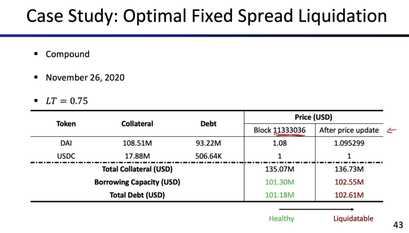 清算者并未使用最大可清算比例(close factor),若使用最大可清算比例,可获得 373 万 DAI。采用两步清算策略(第一步不恢复健康状态,第二步再清算),可实现利润 374.3 万 DAI