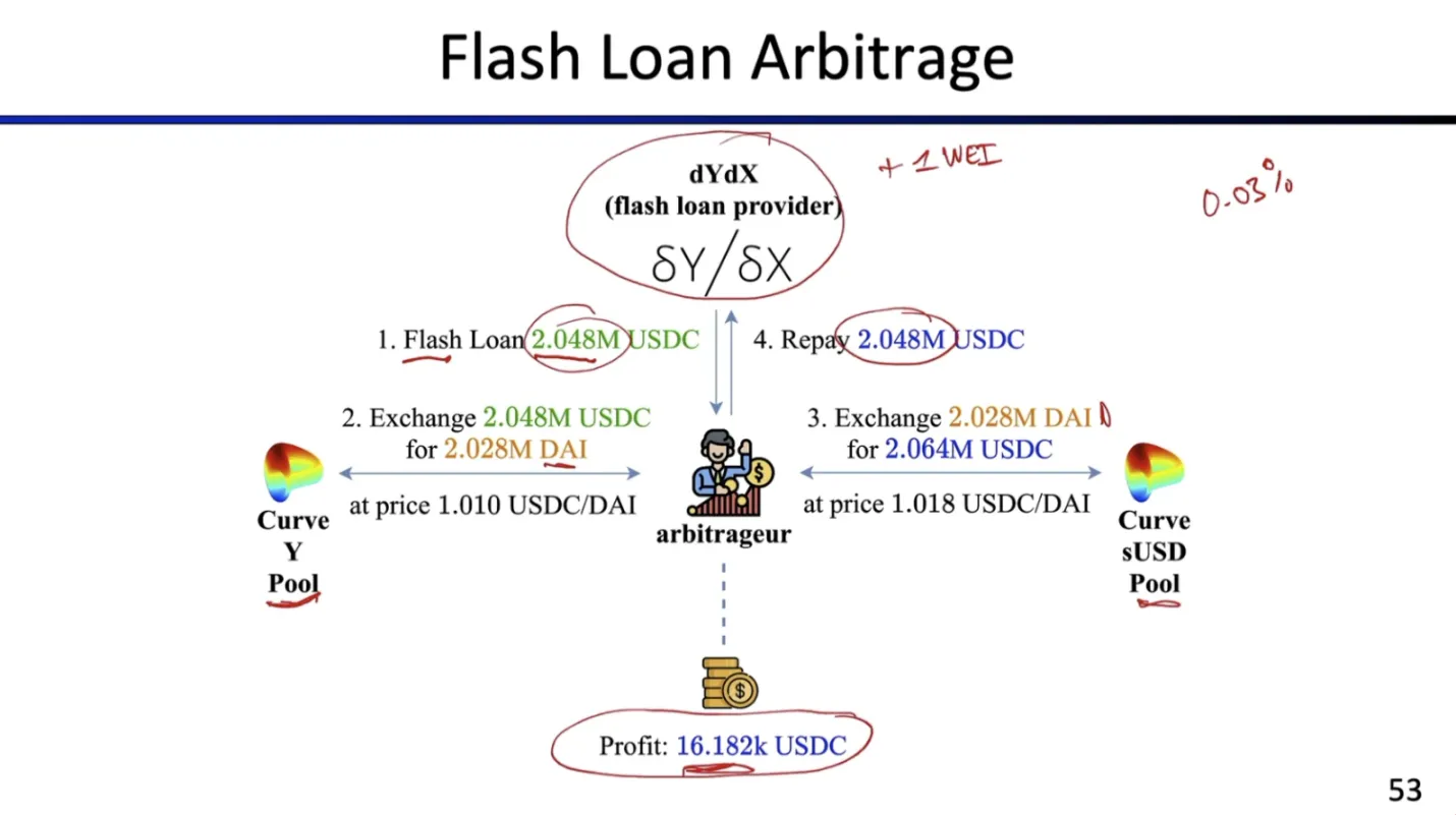 示例:先借 2,048,000 USDC 闪电贷,在 Curve Y 池兑换为 DAI,随后在 Curve sUSD 池兑换回 USDC,扣除利息后获利约 16,000 USDC。