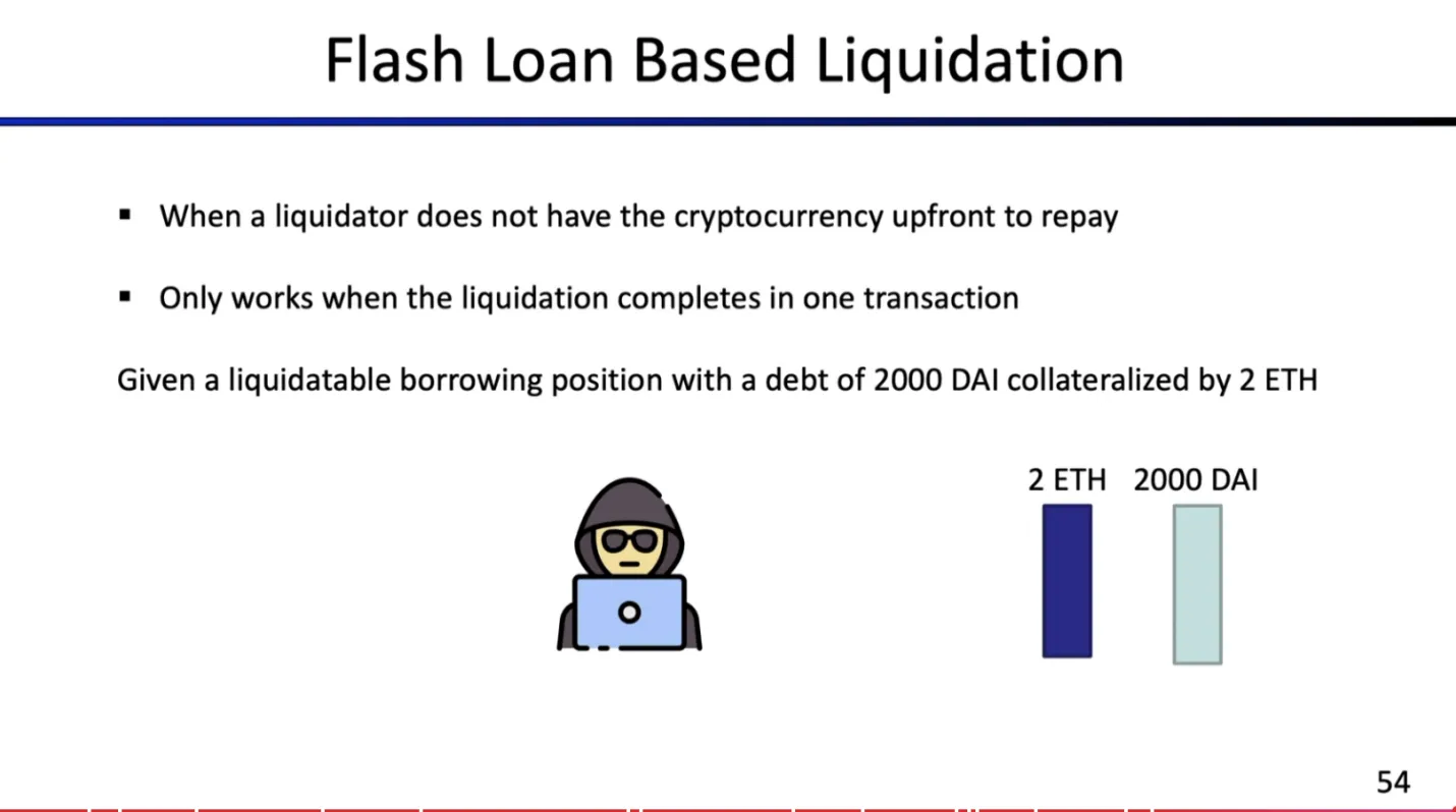 - 操作流程:清算者偿还部分借款(如 DAI);随后获得抵押物(如 ETH),享受折价(通常 5%-15%,Aave 为例),并全部在一次原子交易(atomic transaction)内完成,保证交易执行,不依赖信任
