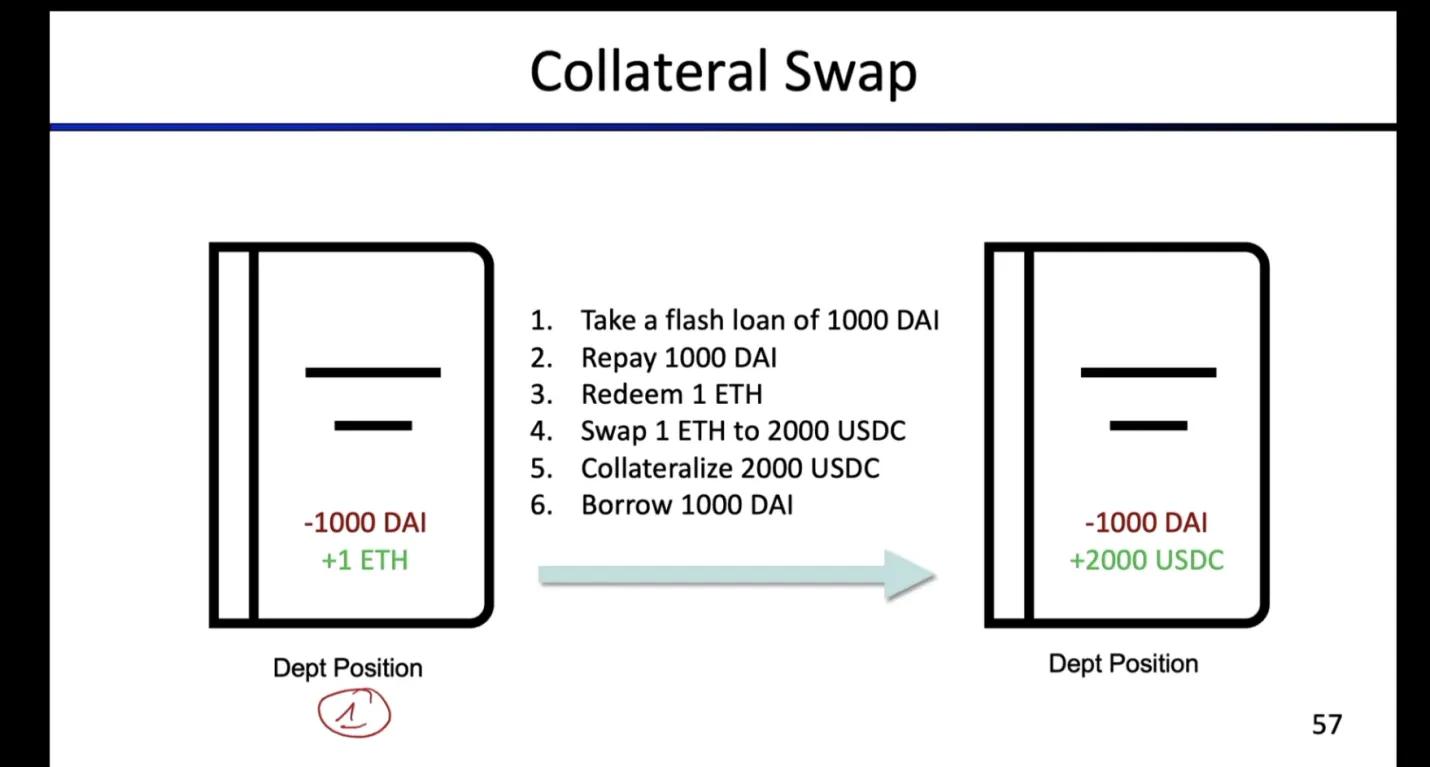 示例:借 1,000 DAI 闪电贷偿还债务,取回 ETH,将 ETH 兑换为等值 2,000 DAI,用 2,000 USDC 作为新抵押物,再次借入 1,000 DAI。结果是将债务转为稳定币,降低清算风险。